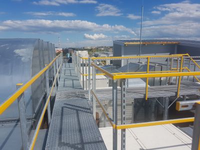 Przy tworzeniu przejść serwisowych i podestów roboczych należy nie tyko wziąć pod uwagę właściwe szerokości przejść z uwagi na sposób eksploatacji i wysokości barierek. Podesty techniczne muszą przenosić właściwe obciążenia, mieć odpowiednio dobrane głębokości i kąt schodów oraz zachowywać bezpieczeństwo użytkowania (kraty wema antypoślizgowe, właściwie zamontowane bortnice, pochwyty barierek ciągłe i bez otworów).